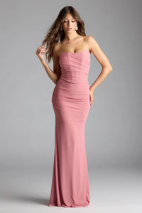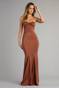 The sleek Liliana knit gown sculpts every curve with a strapless twist corset bodice and a dramatic mermaid silhouette. The floor-length hem flares softly for a finish that’s equal parts timeless and alluring.