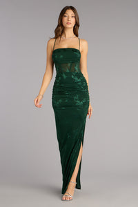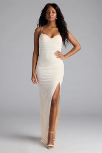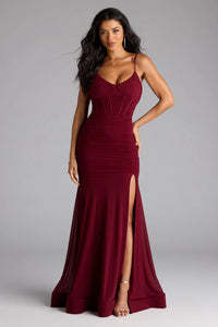 The gorgeous Cesca mesh formal dress sculpts and accentuates your curves with a corset bodice and mermaid silhouette that effortlessly flares out into a dramatic slit floor-length hem!