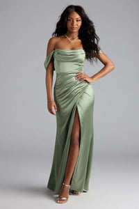 When it comes to elegance, the Lova satin formal dress is the perfect fit. Designed with an alluring off-the-shoulder neckline and a sculpted corset bodice, this dress accentuates your curves in all the right places.