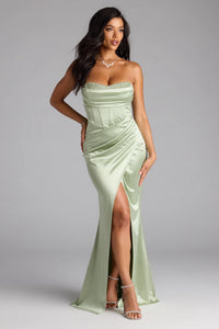 From the faux pearl embellishments to the silky satin construction, the Loren formal dress beautifully elevates your evening out! Attract attention with the waist-cinching corset bodice and mermaid silhouette that offers a show of leg with the high front slit.