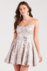 The Meghan party dress is the prettiest pick for dances and beyond! She enchants and mesmerizes in her sleeveless scoop neckline, lightly padded bust, and satin adjustable spaghetti straps that lace up along the open-back design. Her fitted bodice offers a structured fit with flexible boning inserts, princess seams, and a high waist that leads to the short skater silhouette with hidden side pockets to keep your hands warm. The formal party dress is composed of a sequin scroll and glitter mesh woven fabric with a knit lining and tulle trim to create a voluminous effect. Complete your dressy look in this short dress with a sparkly hair accessory and heels.