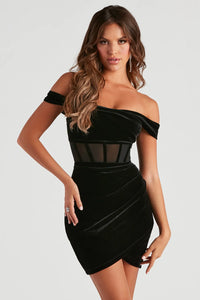 On the short Marla party dress, velvet is the star of the show! Showcase timeless glamour in her off-the-shoulder neckline, corset mesh-illusion bodice with flexible boning inserts, and a sultry, faux wrap hem that gives you the appearance of an hourglass figure. The formal dress is composed of a lined velvet knit fabric with a moderate stretch. Complete your dressy look with a gorgeous rhinestone clutch.