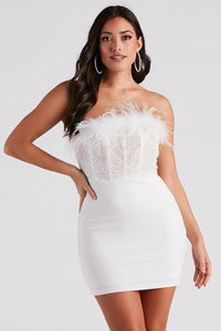 For dance queens or bachelorettes looking to make a memorable entrance, the Anabelle mini party dress will have all eyes on you! She features a strapless mesh corset bodice with feather trim, flexible boning, sequin and bead embroidery, and a flattering bodycon silhouette with a mini-length hem. The party dress is composed of partial-crepe fabric with a stretchy knit lining. Complete the look in this mini dress with statement heels.