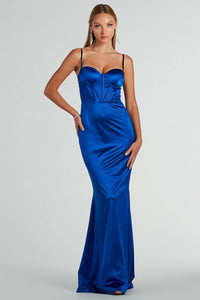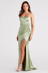 Put your curves on display in the stunning Kacey formal satin dress that makes a gorgeous option for bridesmaids, wedding guests, or school dances! She features a sleeveless square neckline, adjustable spaghetti straps, a corset bodice with flexible boning for a structured look, a padded bust, and a hip pleated side seam that creates the asymmetrical wrap mermaid skirt with a sultry slit along her floor-length hem. The formal dress is composed of silky satin-lined fabric with moderate stretch. Complete the look with earrings and a clutch.
