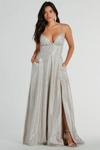 Captivate the room with your enchanting allure in the Skyla glitter woven corset A-line formal dress. Crafted with a glimmering glitter woven fabric, this formal long dress will have you living out your fairytale dreams! She is shaped with a sleeveless V-neckline with pleating at the bust, padded bra cups for support, and a chic corset bodice with flexible boning to create that snatched silhouette. Find your perfect fit with her adjustable spaghetti straps that lead to a back zipper closure for effortless styling. Her high waist flows out to a floor-sweeping A-line skirt giving that regal energy, featuring side pockets to keep your lip gloss on hand! Complete your formal look with gemstone earrings and metallic heels.