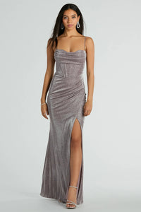 Get whisked away in the Athena glitter formal dress by your date for weddings or prom! A sweetheart cowl neckline and adjustable spaghetti straps create a flattering silhouette, while the corset bodice and padded bra cups provide support and flexibility. The mermaid silhouette and high front wrap slit add a touch of drama to this floor-length dress, crafted from glitter knit fabric. Complete the look with teardrop earrings and strappy rhinestone heels.