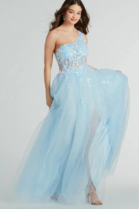 You can't help but feel like a princess in the Arie ball gown blooming with enchanting details to show off at prom, formal birthdays, or balls! The one-shoulder neckline and dual spaghetti straps add sophistication, while the padded bra cups provide support. The sheer corset bodice with flexible boning, sequin and floral applique, and glitter details add a touch of artistry that'll inspire endless compliments! The lace-up back, high front slit, and floor-length hem complete the exclusive A-line silhouette that flatters every figure so you look and feel like a dream come true. Complete the look in lace-up heels and rhinestone jewelry!