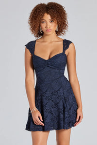 A sleeveless glitter lace dress boasts a sweetheart neckline, a lace-up back meant to turn heads, and a flattering A-line silhouette. Perfect for the school dance or a party.