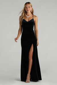 Watch every head turn your way in the Jaymie formal velvet dress showcasing a beautiful silhouette with romantic details! She features a V-neckline, a padded bust, spaghetti straps, a sheer lace back panel with a cutout accent, a mermaid silhouette that flaunts your gorgeous curves, and a high front slit that leads to her floor-length hem. The formal maxi dress is crafted from a luxurious velvet knit fabric that brings simple sophistication to your evening. Complete the look with a rhinestone necklace for a gala dinner or black tie wedding!