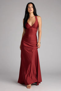 Make a stunning entrance at your next formal affair in the Lola high slit satin dress. This luxurious floor-length dress features a sleeveless cowl neckline, a floor-sweeping silhouette with a sultry high side slit to elongate your legs, and a form-hugging fit. Perfect for weddings, black-tie events, or school dances.