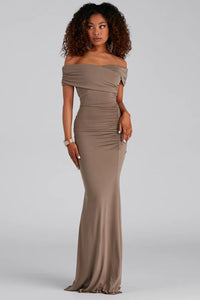 Radiate sexy sophistication in the Maeva formal satin dress! She features a lovely off-the-shoulder folded neckline adorned with short-sleeve cuffs, a side pleated bodice, and a flattering slim silhouette with a sultry wrap-style front slit and floor-length hem. The formal dress is crafted from a silky satin fabric with a luxe sheen. Complete the look for black tie galas or charity dinners with a glam hair accessory.