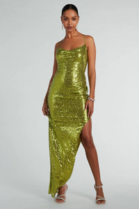 Steal all the glances as you strut into your formal affair in the iconic Jennifer strappy back high slit sequin dress! Crafted with all-over glitzy sequin embroidery on mesh fabric, this fabulous formal dress will have you radiating major glam energy. Her sleeveless bodice is shaped with a chic draped cowl neckline and spaghetti straps that lead to her bold open back with a sultry cross-back strappy design. Her asymmetric high side slit will showcase some skin along her floor-length slim-fit silhouette. Complete your look with metallic heels.