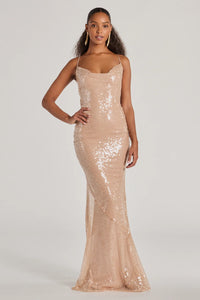 You're sure to be a spellbinding sight to see in the Rachael sequin formal dress at galas or fancy soirees! The cowl neckline and spaghetti straps add a delicate touch to the mermaid silhouette, while the lace-up back ensures a perfect fit. Adorned with sequin embellished mesh fabric, the floor-length hem adds a touch of luxury to your formal look. Complete the look with earrings, a bracelet, and heels for divine glamour!