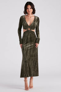 Every guest will be crushing on you in the Kori formal velvet dress perfect for engagement parties and a dressy casino night! She features long sleeves, a plunge v-neckline, a back keyhole with button closure, a center front o-ring insert and a cutout waist and back, and a slim curve-hugging midi-length silhouette. The formal dress is composed of stretchy crushed velvet fabric. Complete the look in clear stiletto heels.
