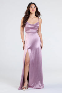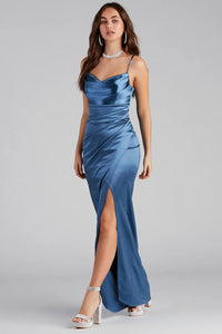 Wrap yourself in the sleek and stunning Annabelle knit satin formal dress for effortless glamour! She features a sleeveless cowl neckline with a padded bust, adjustable spaghetti straps for a customized fit, front ruching at the waist, and a floor-length, wrap-front skirt with a fitted A-line silhouette. Style this long dress with sparkling rhinestone earrings.