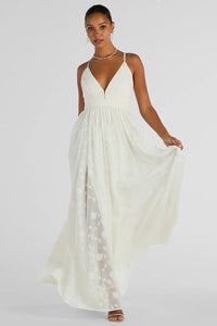 Made for sparkling entrances, the Alima floor-length glitter gown sculpts and shimmers with every step. The off-the-shoulder neckline and front ruched seam lead to a dramatic high slit—elegance with just the right amount of allure.