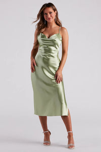 This silky sleek satin slip midi dress will create the prettiest party outfit! It features a sleeveless cowl neckline, adjustable spaghetti straps for a customized fit, a midi-length hem, and a flowy A-line silhouette. The lightweight satin woven fabric will catch the light with its eye-catching sheen. Style with a pair of platform heels.