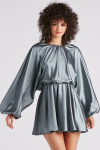 A luxe style that flaunts relaxed, sophistication that's perfect for wedding guests and celebrations! The Natalie formal dress features a crew neckline, long peasant sleeves with elastic cuffs, a back keyhole with tie closure, and a cinched waist leading to her short-length hem. The formal dress is composed of a satin knit fabric with a subtle sheen. Style with statement heels to complete your dressy look!