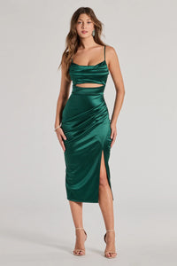 Reign the night in this satin midi dress featuring a sleeveless cowl neckline, spaghetti straps, and a form-hugging midi silhouette accented with an asymmetrical high slit.