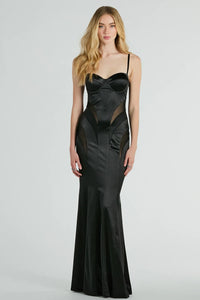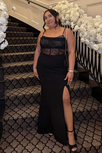 The Josette sleeveless corset mermaid dress is a statement-making look that will have all eyes on you at your formal event! This form-hugging long crepe mermaid dress features a sleeveless sweetheart cowl neckline with adjustable spaghetti straps for a secure fit, a sheer floral lace corset-styled bodice with contrast piping accents, and a high side slit. Complete styling with a rhinestone clutch.