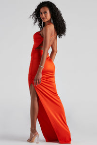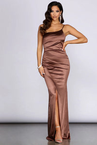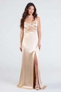 Make a showstopping entrance in the always stunning Maisy satin formal dress! She features a sleeveless V-neckline with a twist-front design, spaghetti straps, an alluring front cutout at the waist, and a floor-sweeping A-line silhouette with a chic high side slit to show off some leg. The satin-knit fabric showcases a luxe sheen for a glamorous vibe. Style with rhinestone heels for your next gala!