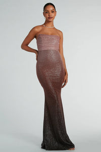 Radiant shine in the Clarence glitter floor-length formal dress at dances and red-carpet events! The sleeveless gown sparkles in a corset bodice on top of a flattering A-line silhouette showcasing a high front slit for sultriness.