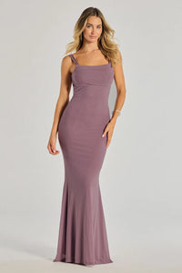 Make bold style moves in the Liliana long knit formal dress! She features a sleeveless cowl neckline, spaghetti straps that lead to a cross-back, lace-up design, a high waist seam, ruched side seams, and a curve-hugging, floor-length hem with an asymmetrical high side slit. The long dress is composed of a smooth stretchy knit fabric for comfortable wear. Complete the look with sleek stilettos.