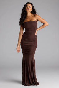 Waltz through the day with sultry grace in the Chloe long column formal dress showcasing a lace-up back that adds elegance while the front slit and ruched seams accentuate your figure!