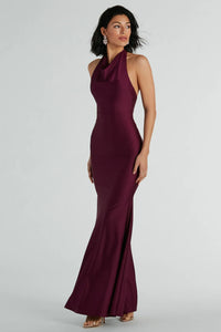 Timeless with a sexy twist! The Diane formal long dress is a sophisticated choice for bridesmaids and wedding or black tie party guests! She features a sultry cowl halter neckline that flaunts your femme allure, a neck strap with dual button closures, a sexy open back, a curve-enhancing backside ruched seam, and a flattering mermaid silhouette and floor-length hem. The formal maxi dress is crafted from a smooth knit fabric that fits like a glove and offers plenty of stretch. Complete the look with earrings and a clutch.