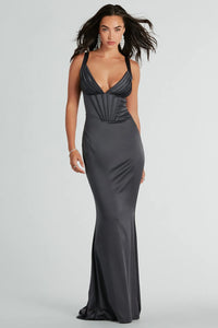 Catrina Formal V-Neck Corset Mermaid Satin Dress