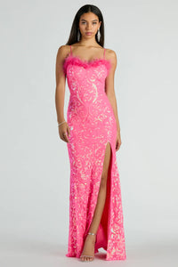 Cara Marabou Trim Mermaid Slit Sequin Formal Dress