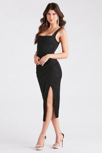 Show up and stun like the glitzy babe you are in the Marianna ruched glitter knit formal midi dress! Crafted with a glistening glitter knit fabric, all eyes will be on you as you take the dance floor. She features a sleeveless sweetheart neckline with subtle chic draping, adjustable spaghetti straps to find your perfect fit, ruching down the side and back seams to accentuate your gorgeous curves, a thigh-high side slit to add some allure, and a bodycon silhouette. Complete your look with rhinestone heels for all the more sparkle!