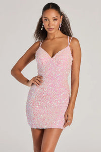 Show up and stun this formal season in the gorgeous Brynlee bodycon mini dress! She features a sleeveless square neckline, a built-in padded bust, halter spaghetti straps, an open back with a lace-up design for a customized fit, and a short, curve-hugging silhouette. The lined mesh fabric features all-over sequin embroidery in an intricate scroll pattern. Style the formal mini dress with clear heels for a night to remember.