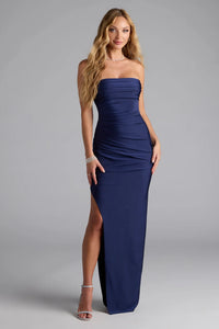 Sweeping everyone off their feet is easy in the Ainsley formal dress as a striking bridesmaid, wedding, or gala guest! The strapless neckline and column silhouette create a sophisticated look, while the pleated side seams add a touch of texture. The high side slit and floor-length hem provide an alluring twist, perfect for any formal occasion.