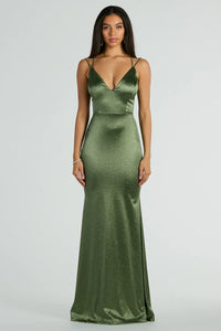 Cause commotion as you shine through the night in the Macy glitter satin formal dress at banquets or weddings! Crafted from glitter satin fabric, it's the perfect choice for your next special occasion. Her V-neckline and padded bra cups provide a flattering fit, while the dual spaghetti straps add an elegant touch. The lace-up detail and curve-hugging slim silhouette make this floor-length dress a show-stopper! Complete the look with a dainty bracelet and ring set.