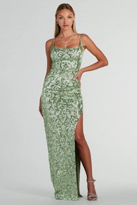 Catch the light and attention in the beautiful Saskia sequin satin formal dress that dazzles in luxury at prom, black tie galas, and weddings! This exquisite gown boasts a plunging V-neckline for a sultry touch, padded bra cups for support, and spaghetti straps for a flawless fit that lace up in the back. Her mermaid silhouette adds a touch of elegance, while the bonded floor-length hem and sequin-scroll embroidered silky satin fabric create a truly opulent piece. Finish the look with this stunning gown with a lariat necklace, bracelet, and heels for a striking style!