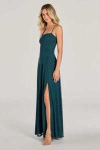A sleeveless formal dress features a sleek square neckline, spaghetti straps, and an A-line floor-length silhouette showcasing a sultry front slit. The glitter knit fabric offers plenty of stretch for comfort.