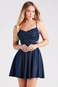 Give off a stunning shine that will capture total glam vibes at HOCO with the Taya woven glitter formal skater dress! She features a sleeveless cowl neckline, a built-in padded bust that eliminates the need for a bra, and adjustable spaghetti straps for a customized fit. The sheer mesh waist inserts at each side show off a hint of skin leading to high waist seams, a short skater skirt with hidden side pockets, and a flirty fit and flare silhouette. The woven glitter fabric includes a full-length lining. Complete your look with rhinestone fringe earrings and metallic platform heels!
