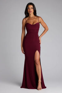 Bring glamorous vibes in the Millie formal dress featuring a square neckline and spaghetti straps that accentuate your figure while the lace-up back adds a touch of elegance. With a side slit and fitted column silhouette, this long dress exudes sophistication and style.