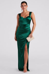 A luxe style with stunning detail, unveil modern glamour in the Lorelli formal satin dress at banquets and bridesmaids. She features a sleeveless sweetheart neckline, wide shoulder straps, a lightly padded bust, a corset-seam bodice, and an asymmetrical wrap skirt with a slit along the floor-length hem. The formal dress is composed of buttery smooth satin fabric with minimal stretch. Style this long dress with a clutch and block heels to complete the look!