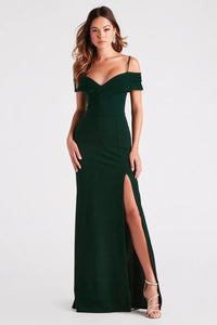 Classic with a chic flair, the Serene formal mermaid dress is a perfect pick to wear as a wedding guest or a bridesmaid! She features a cold-shoulder design with spaghetti straps and short off-the-shoulder sleeves, a pleated sweetheart neckline with a faux wrap-front design, a fitted high waist seam, a floor-length hem with a thigh-high front slit, and a form-hugging mermaid silhouette. The crepe fabric offers a moderate stretch. Style with rhinestone studs and block heels.