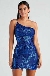 Bring the shine to prom in a sequin dress that illuminates the night! Kai features a trendy one-shoulder neckline, a bodycon silhouette that flaunts your curves, and a short-length hem. The dress is composed of a lined mesh fabric that offers minimal stretch and an all-over dazzling sequin scroll pattern. Complete the look with a silver purse and heels.
