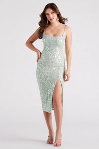 Prepare to glisten like never before in the Kim glitter midi dress to make a beautiful impression at spring weddings or formal parties! Crafted from sparkling glitter knit fabric, this midi-length dress is designed with a flattering cowl neckline and spaghetti straps. The flattering bodycon silhouette features a front ruched seam and slit to highlight your figure. Perfect for a night out, this dress will make you feel elegant and exclusive! Complete the look with a clutch and heels.
