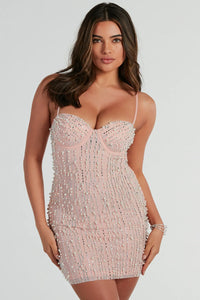 Dare to take everyone's breath away in the striking Katie party dress perfect for school dances or celebrations! She features a sleeveless sweetheart neckline, adjustable spaghetti straps for a customizable fit, a built-in padded bust with an underwire, and a short bodycon silhouette. The dress is composed of a nude mesh fabric with a knit lining and all-over rhinestone and faux pearl embellishments. Style with fringe earrings and platform heels to complete the look!