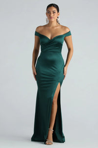 Look glamorous in the Nancy formal satin dress to make your debut at fancy holiday parties or banquets! She features an off-the-shoulder sweetheart neckline with short-sleeve cuffs, a wrap-style bust, and a flawless mermaid silhouette, high front slit, and floor-length hem. The formal dress is crafted from a smooth satin fabric with a sheen effect for the perfect shine and has a bust lining. Complete the look with a dainty rhinestone tennis bracelet and heels.