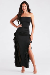Bring the romantic allure to your fancy affair in the Kenna rosette applique ruffled formal dress. She features a strapless straight-across neckline, ruching at the waist and down the sides seams, chic rosette applique accents on each side, side ruffled accents and trims, dual thigh-high side slits, and a floor-length hem with a slim-fit silhouette. The lined smooth knit fabric offers plenty of stretch. Style with strappy stilettos for a stunning wedding guest look.