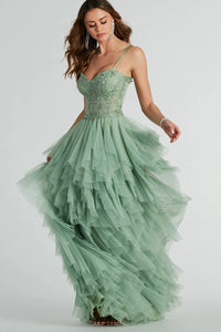 Live out your fairytale dream in the Keyla floral applique tiered ruffle tulle gown for an enchanting night! The corset bodice is sheer for that hint of allure, accented with a gorgeously chic floral applique with small rhinestones for a regal sparkle. The fitted high waist leads to a floor-sweeping tiered ruffle design to give you a voluminous effect for all the drama.