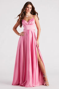 You'll be the breathtaking view in the Gillian formal satin dress at prom or black tie weddings! She features a sleeveless V-neckline with a pleated and lightly padded bust, adjustable spaghetti straps, an empire waist with hidden side pockets to keep your hands warm, and a flattering A-line silhouette with a front slit and floor-length hem. The formal dress is composed of smooth satin fabric with a woven lining and no stretch. Complete the look with a gorgeous teardrop necklace and earrings.