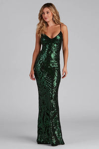 Serena Sequin Mesh Mermaid Dress Serena Sequin Mesh Mermaid DressSpecial Occasion Showcase your show-stopping looks in the gorgeous Serena mermaid dress. She features a sleeveless bodice, adjustable spaghetti straps, a deep V-neckline with padding, and a backless design with a lace-up closure that lets you adjust the fit. Her high waist seam leads to a floor-length, curve-hugging mermaid silhouette for a chic factor. The dress is composed of a sheer mesh fabric with an all-over intricate sequin design and includes a stretchy knit lining. Complete your outfit with radiant earrings and a rhinestone cuff. Fit & Features - Adjustable spaghetti straps | V-neckline