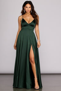 Carmen High-Slit Satin Formal Dress Carmen High-Slit Satin Formal DressSpecial Occasion Strut with style at your next special event in the gorgeous Carmen satin formal dress. She features a sleeveless, deep V-neckline, adjustable spaghetti straps, a form-hugging silhouette, and a floor-sweeping skirt with a sultry thigh-high front slit. Complete the look with statement earrings and a sparkly evening bag. Fit & Features - Sleeveless V-neckline, adjustable spaghetti straps